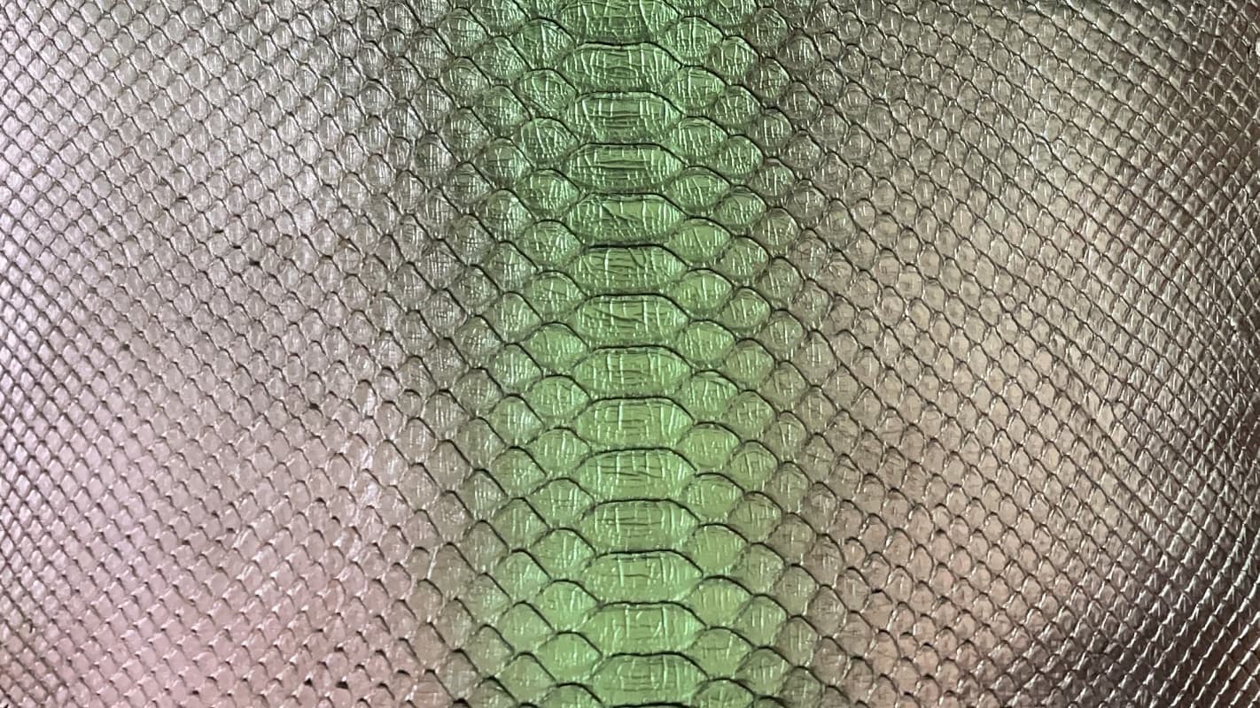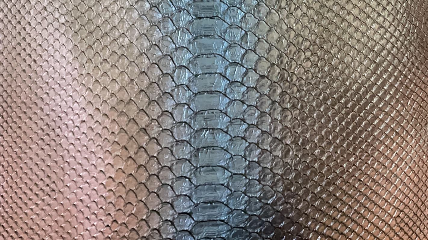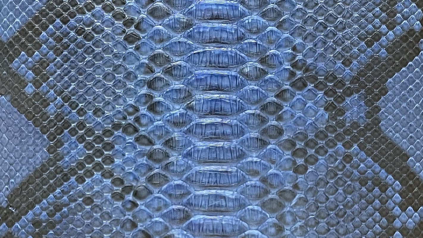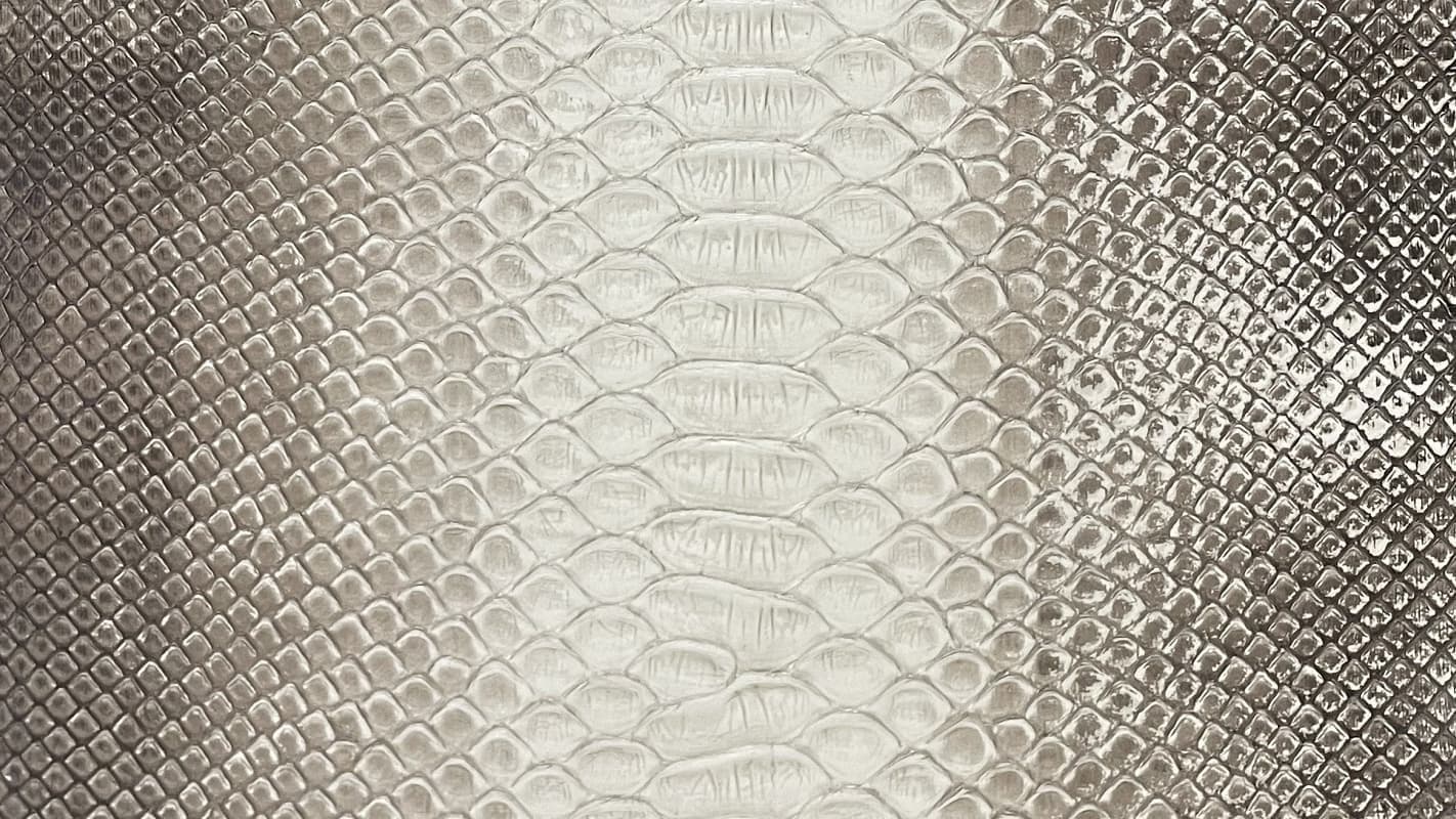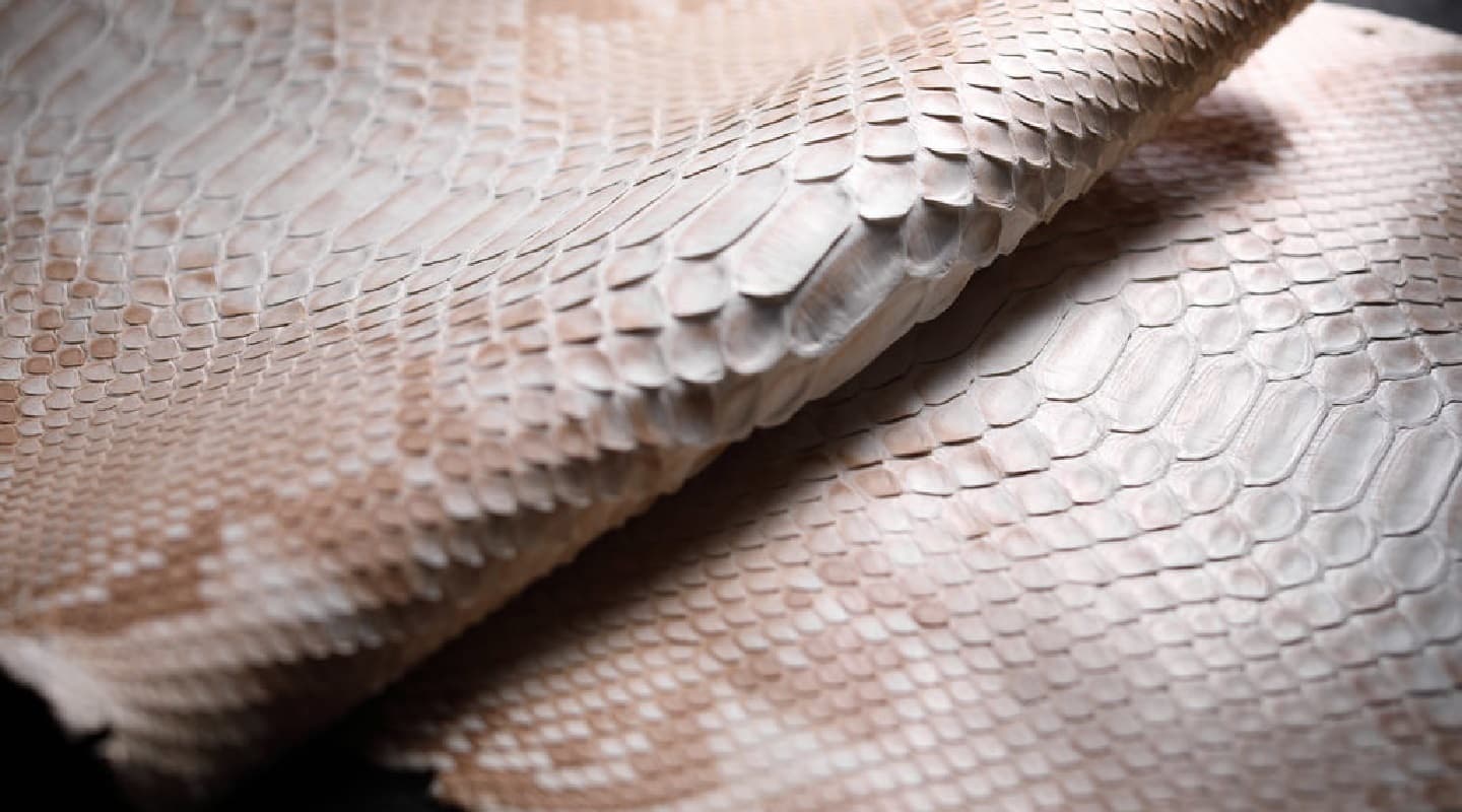 | パイソン革 | 他に類のない斑紋(はんもん)やウロコ模様を持ち、個性的で重厚な質感を醸し出します。当社取扱いのパイソンは、腑が大きく、ワイルドな印象を演出できるのが特徴です。 全身にダイヤ型の連続的な斑紋・模様があるところから、ダイヤモンドパイソンと呼ばれています。 皮質の丈夫さや、大きさの点では利用度も高く、他の皮革には見られない美しさがあります。 |